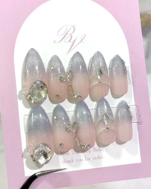 指先にきらめく、本格ワンホンビジューアート。 小ぶりなストーンを贅沢に散りばめ、 ベースカラーのツヤ感を最大限に引き立てました。 ふとした瞬間、手元を見るたびに気分が上がる。 スマホを触るたび ふんわりと光を反射するストーンに思わずうっとり。 ベースカラーは 「素の指先をもっと綺麗に見せる」 ピンクベージュ。 ホワイトグラデーションを重ねることで、 透明感と女性らしい気品をプラスしました。 カフェでドリンクを持つ手、 街を歩く何気ない瞬間も 「少し特別な日常」 を体感できるはず。 ┈┈┈┈┈┈┈┈┈┈┈┈┈┈┈┈┈┈┈┈ 商品詳細 ▪︎ 商品内容:ネイルチップ10枚(両手分) ▪︎ 付属品:装着キット(接客テープ1回分、アルコールシート、ウッドスティック、ミニやすり) ▪︎ サイズ:お客様のサイズに合わせて作成 ▪︎ 着用画像:コフィン着用 ┈┈┈┈┈┈┈┈┈┈┈┈┈┈┈┈┈┈┈┈ ご購入後の流れ ①商品をカートに入れて決済 ②ご入金確認後、計測用チップ(無料)を即日発送 ③計測用チップでご計測 ④決まったサイズをInstagram【@belvi_nailtip】のDMへ連絡 ⑤ネイルチップを製作 ⑥発送 ┈┈┈┈┈┈┈┈┈┈┈┈┈┈┈┈┈┈┈┈ お届けまで ・お急ぎ便あり:ご入金確認後7日で発送 ・お急ぎ便なし:ご入金確認後15日で発送 ・発送方法 :日本郵便(発送から1~2日ほどで到着) ┈┈┈┈┈┈┈┈┈┈┈┈┈┈┈┈┈┈┈┈ サイズのこだわり 当店では計測用チップが無料のほか ▪︎ カーブを緩めるフラット加工 ▪︎ 根本を真っ直ぐにするストレート加工 ▪︎ 長さを短くする加工 上記3点を他店様では有料オプションのところ 当店では、すべて【無料】で承っております。 平爪、大きい爪、小さい爪、など 爪の形に自信がない方や サイズに不安がある方はお気軽にご相談ください。 【計測方法はこちら↓】 https://rightful-innocent-7c8.notion.site/15aac285b8ef80898f73e84a61b30044?pvs=4